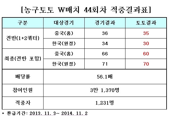 국민체육진흥공단(www.kspo.or.kr)이 발행하는 체육진흥투표권 수탁사업자인 스포츠토토(www.sportstoto.co.kr)는 지난 2일 밤 10시에 태국 방콕에서 열린 아시아선수권대회 준결승 중국(홈)-한국(원정)전을 대상으로 한 농구토토 W매치 44회차에서 1231명의 적중자가 나왔다고 밝혔다.