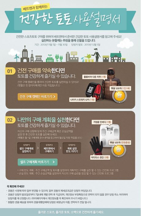 [스포츠토토] 국민체육진흥공단(www.kspo.or.kr)이 발행하는 체육진흥투표권 수탁사업자인 스포츠토토의 공식온라인 발매사이트 베트맨(www.betman.co.kr)이 11월 한달 동안 건전화 프로그램 참여 이벤트 '건강한 토토 사용설명서'를 실시한다.