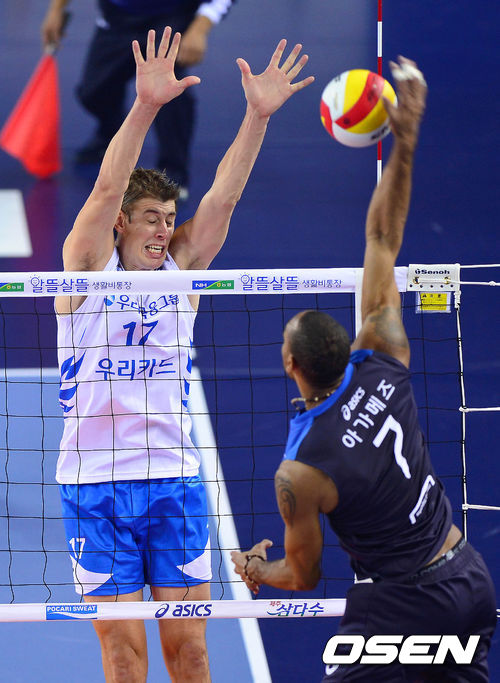 2세트 우리카드 루니가 블로킹을 시도하고 있다./sunday@osen.co.kr