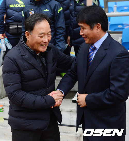 3일 오후 인천축구전용경기장에서 열린 '현대오일뱅크 K리그 클래식' 울산 현대와 인천 유나이티드의 경기 시작전 김호곤 감독과 김봉길 감독이 인사를 나누고 있다.