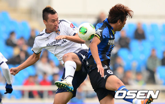 3일 오후 인천축구전용경기장에서 열린 '현대오일뱅크 K리그 클래식' 울산 현대와 인천 유나이티드의 경기 전반 김신욱과 손대호가 볼다툼을 펼치고 있다.