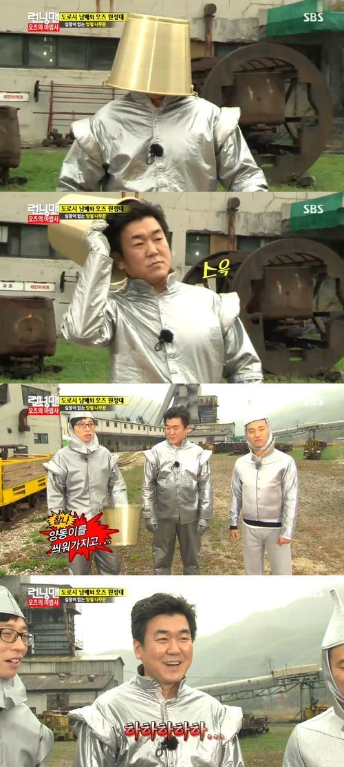 양동이를 쓴 양철 나무꾼은 윤제문이었던 것. 유재석은 "어떻게 이런 걸 입히냐"고 했고 윤제문은 아무 말 없이 웃기만 했다.