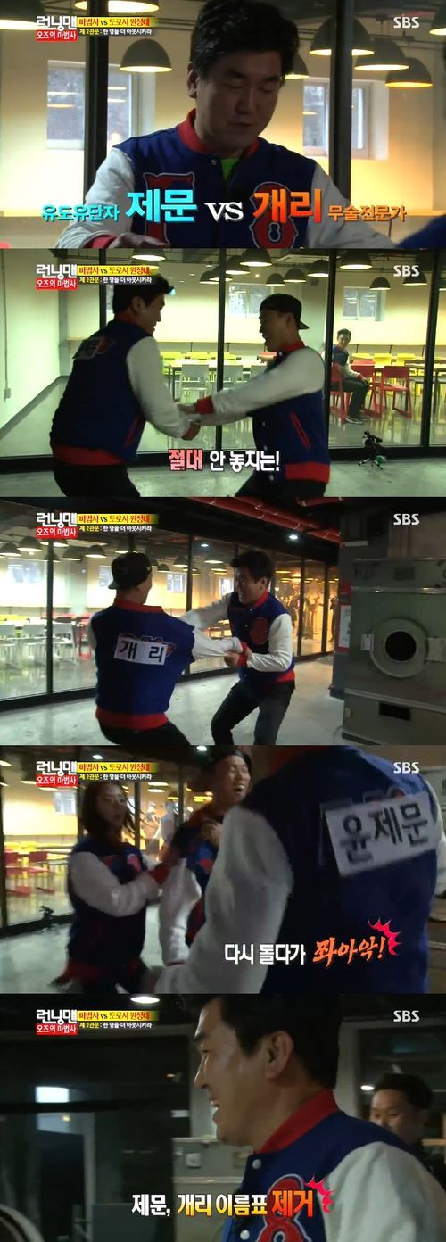 유도유단자 윤제문과 무술전문가 개리는 치열한 대결을 펼쳤고 윤제문이 개리의 옷을 놓치 않고 빠른 속도로 빙글 빙글 돌더니 개리의 이름표를 제거했다.