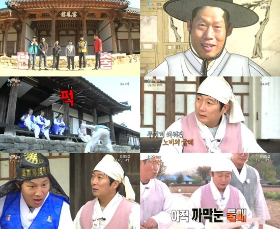 이날 방송에서 여섯 명의 멤버들은 반으로 나뉘어 양반과 노비가 됐다. 엄태웅, 차태현, 김종민이 게임에서 승리해 양반이 됐고, 유해진, 이수근, 성시경이 노비 옷을 입었다.