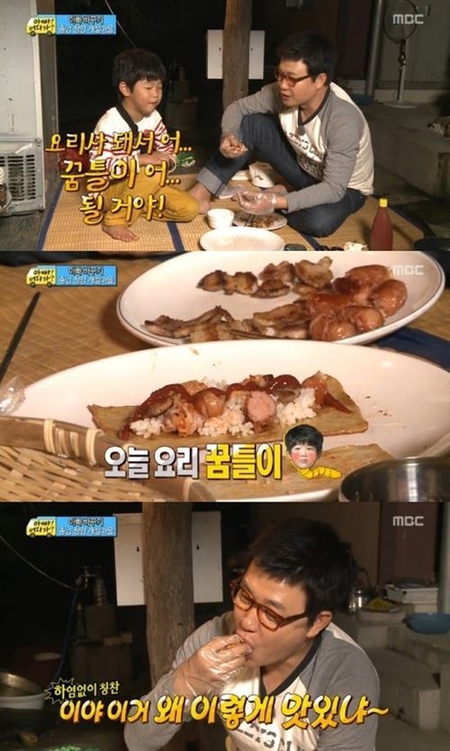 이에 김성주는 “삼촌이 요리를 잘 못하는데 준수 없이 혼자하려니까 힘드네"라며 준수의 도움을 요했고, 준수는 자리에서 벌떡 일어나 구운 어묵 위에 밥과 김치, 소세지를 얹은 어묵 김밥을 만들어 달라고 주문했다.