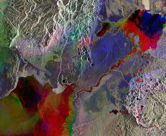 엔비샛(Envisat) 위성의 레이더에 잡힌 우간다 서부 지역이 각양각색의 색깔을 띄고 있다.
