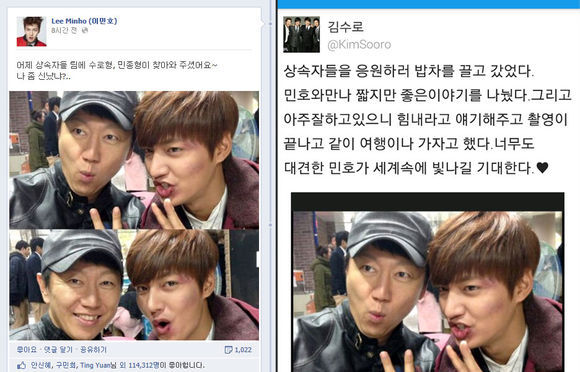이에 이민호는 자신의 SNS 를 통해 김수로와 함께 찍은 사진을 올리며 "어제 상속자들 팀에 수로형, 민종 형이 찾아와 주셨어요~ 나 좀 신났냐? 형님들 너무 감사드려요~"라는 인사를 전했다.
