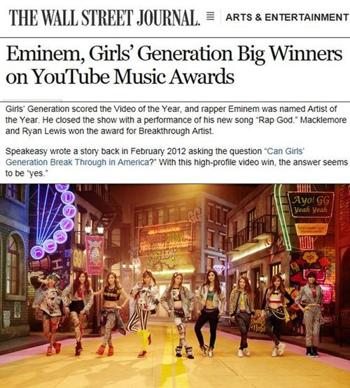 월 스트리트 저널은 "세계의 동영상을 모두 모아 볼 수 있는 유튜브 어워드에서 뮤직비디오에는 소녀시대가, 아티스트로는 에미넴이 승리자가 됐다"며 "특히 소녀시대는 지난해 한 차례 미국 시장을 뚫을 수 있을까라는 기사를 실은 적이 있는데, 이번의 뮤직비디오상 수상으로 이에 대한 답은 '예스'가 될 것 같다"고 설명했다.