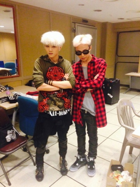 공개된 사진에는 이날 생방송으로 진행됐던 SBS '인기가요'의 대기실에서 멋진 포즈를 취하고 있는 지드래곤과 제로의 모습이 담겨있다. 제로는 평소 지드래곤 선배의 음악과 스타일을 존경해 왔다고 밝혀온 만큼 지드래곤과 비슷한 패션스타일, 외모를 드러내 눈길을 끈다.
