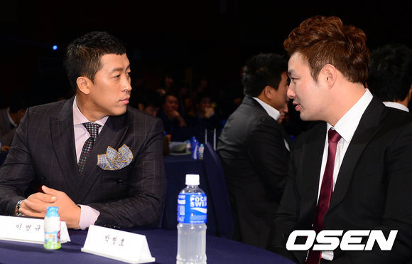 4일 오후 서울 삼성동 그랜드 인터컨티넨탈 서울 파르나스에서 열린 '2013 한국야쿠르트 세븐 프로야구' 정규 시즌 MVP 및 부문별 시상식에서 이병규와 박병호가 이야기를 나누고 있다.