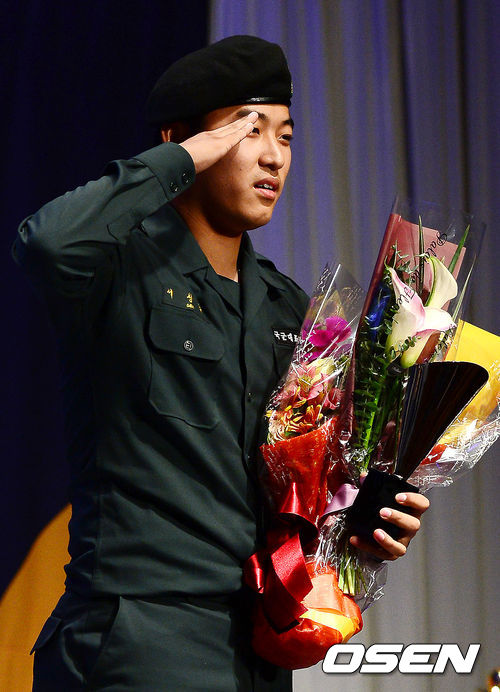 4일 오후 서울 삼성동 그랜드 인터컨티넨탈 서울 파르나스에서 열린 '2013 한국야쿠르트 세븐 프로야구' 정규 시즌 MVP 및 부문별 시상식에서 상무 서상우가 퓨처스리그 남부리그 최다타점상을 수상하고 거수경례를 하고 있다.