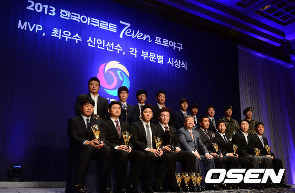 4일 오후 서울 삼성동 그랜드 인터컨티넨탈 서울 파르나스에서 열린 2013 한국야쿠르트 세븐 프로야구 정규 시즌 MVP 및 부문별 시상식에서 MVP 박병호를 비롯한 영광의 얼굴들이 포토타임을 하고 있다.