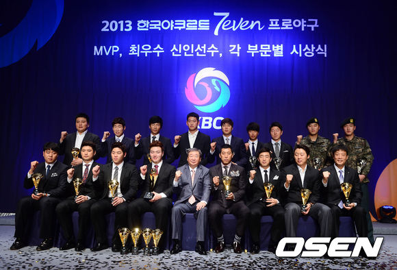 4일 오후 서울 삼성동 그랜드 인터컨티넨탈 서울 파르나스에서 열린 2013 한국야쿠르트 세븐 프로야구 정규 시즌 MVP 및 부문별 시상식에서 수상자들이 기념촬영을 갖고 있다.