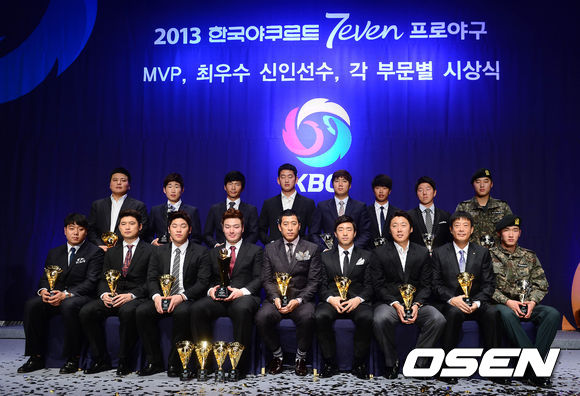 4일 오후 서울 삼성동 그랜드 인터컨티넨탈 서울 파르나스에서 열린 2013 한국야쿠르트 세븐 프로야구 정규 시즌 MVP 및 부문별 시상식에서 수상자들이 기념촬영을 갖고 있다.