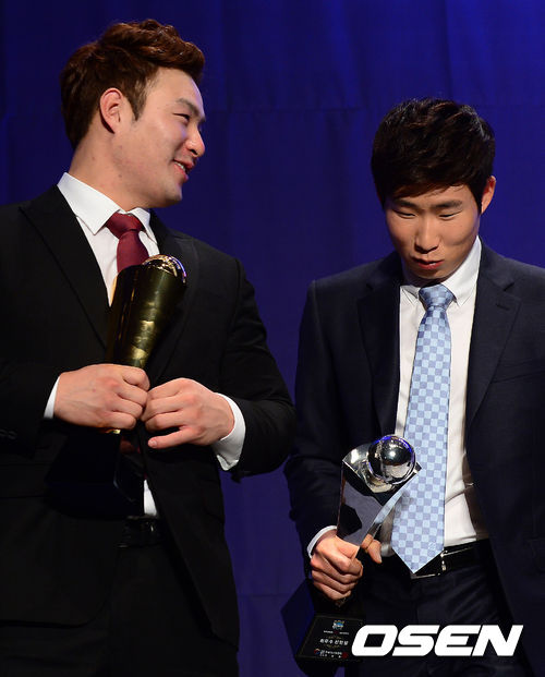 4일 오후 서울 삼성동 그랜드 인터컨티넨탈 서울 파르나스에서 열린 2013 한국야쿠르트 세븐 프로야구 정규 시즌 MVP 및 부문별 시상식에서 MVP 넥센 박병호와 신인상 NC 이재학이 이야기를 나누며 미소짓고 있다.