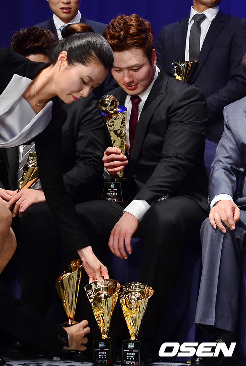 4일 오후 서울 삼성동 그랜드 인터컨티넨탈 서울 파르나스에서 열린 2013 한국야쿠르트 세븐 프로야구 정규 시즌 MVP 및 부문별 시상식에서 박병호가 기념촬영 전 수상 트로피를 자리에 놓고 있다.