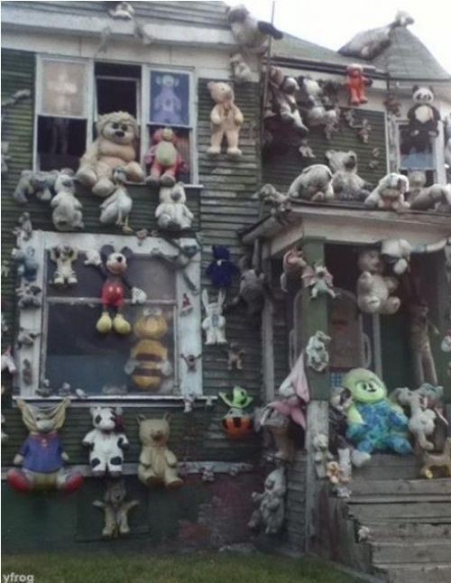 '무서운 인형의 집' 사진 속에서는 먼저 으스스한 분위기를 풍기는 낡은 저택이 모습을 나타내고 있다. 그런데 이 고택의 외면에는 온갖 흉칙한 인형들이 가득 매달려 있어 눈길을 모은다. 그래서 이 집의 이름이 '무서운 인형의 집'으로 지어진 게 분명하다.