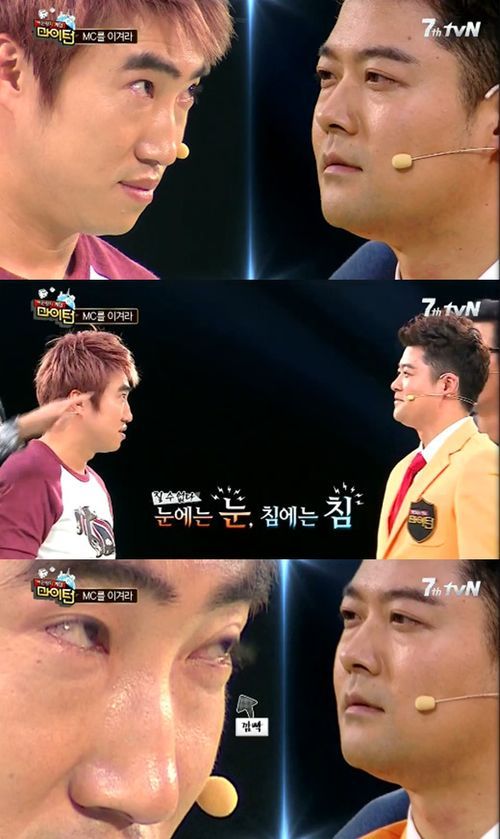 이를 통해 100만 캐시를 확보한 장동민은 2연승에 도전했다. 2라운드 대결은 눈싸움이었다. 이에 서로를 노려보던 전현무와 장동민은 얼굴에 침을 뱉는 듯 한 제스처로 반칙을 시작했다. 급기야 전현무는 손을 휘둘러 장동민의 눈을 감게 한 비신사적인 모습으로 반칙패를 당했다.