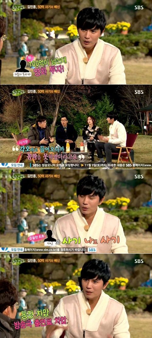 4일 오후 SBS '힐링캠프, 기쁘지 아니한가'(이하 '힐링캠프')에 게스트로 출연한 김민종은 영화 투자자라고 소개받은 사람에게 투자비용과 자신의 자동차까지 뺏긴 경험을 털어놨다.
