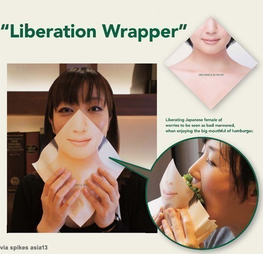 이 여성을 위한 햄버거 포장지는 최근 일본의 한 햄버거 회사가 개발해 인기를 끌고 있다고. 비결은 햄버거를 먹을 때 드러나기 쉬운 온갖 추한 상황을 감출 수 있는 마스크 형이라는 점이다.