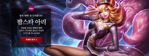 라이엇게임즈는 "팝스타 아리는 전세계 리그오브레전드 커뮤니티에서 많은 관심과 사랑을 받은 플레이어 아이디어로 탄생한 매우 특별한 스킨"이라고 소개한 뒤 "영혼을 홀리는 분홍빛 하트와 치명적 선율의 음표로 무장한 발랄하고 귀여운 구미호 여가수를 직접 게임으로 만나봐달라"고 당부했다.