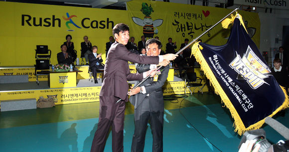 러시앤캐시는 5일 경기도 안산 상록수체육관에서 홈 첫 경기인 대한항공전에 앞서 창단식을 열었다. 최윤 러시앤캐시 회장과 신원호 한국배구연맹 사무총장, 김철민 안산시장 등 구단과 연맹, 시 관계자가 참석한 가운데 진행된 창단식을 통해 V리그 남자부 7개 구단의 '막내' 러시앤캐시가 공식적인 첫 선을 보였다.