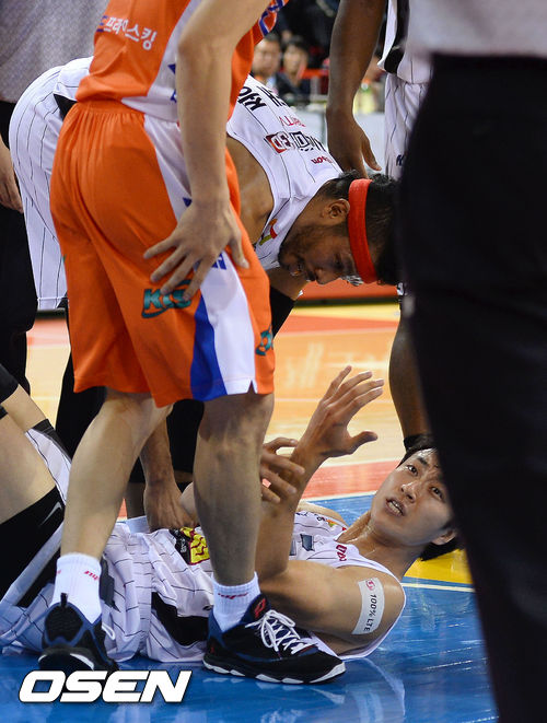 2쿼터, 전자랜드 한정원, 포웰과 충돌을 일으킨 LG 김영환이 코트에 누워 심판결과에 항의를 하고 있다.