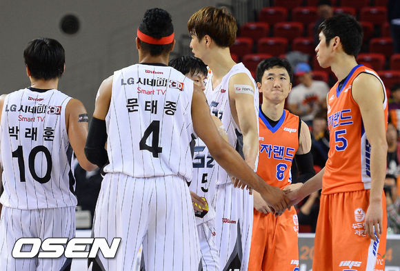 경기종료, LG문태종이 전자랜드 김상규와 인사를 나누고 있다. /ouxou@osen.co.kr