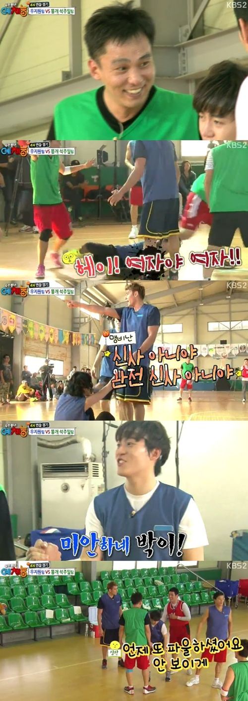 이날 석주일은 똥개 농구의 진수를 보여주겠다며 여성 멤버 이혜정을 온 힘을 다해 밀어 넘어뜨리거나 존박의 낭심을 공격하는 모습을 보였다.