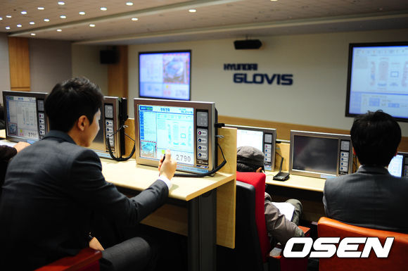 매주 목요일 경매 시장이 열리는 현대글로비스 오토옥션 양산경매장에서 지난 달 31일, 현대글로비스 관계자가 모니터 작동 상태를 확인하고 있다.