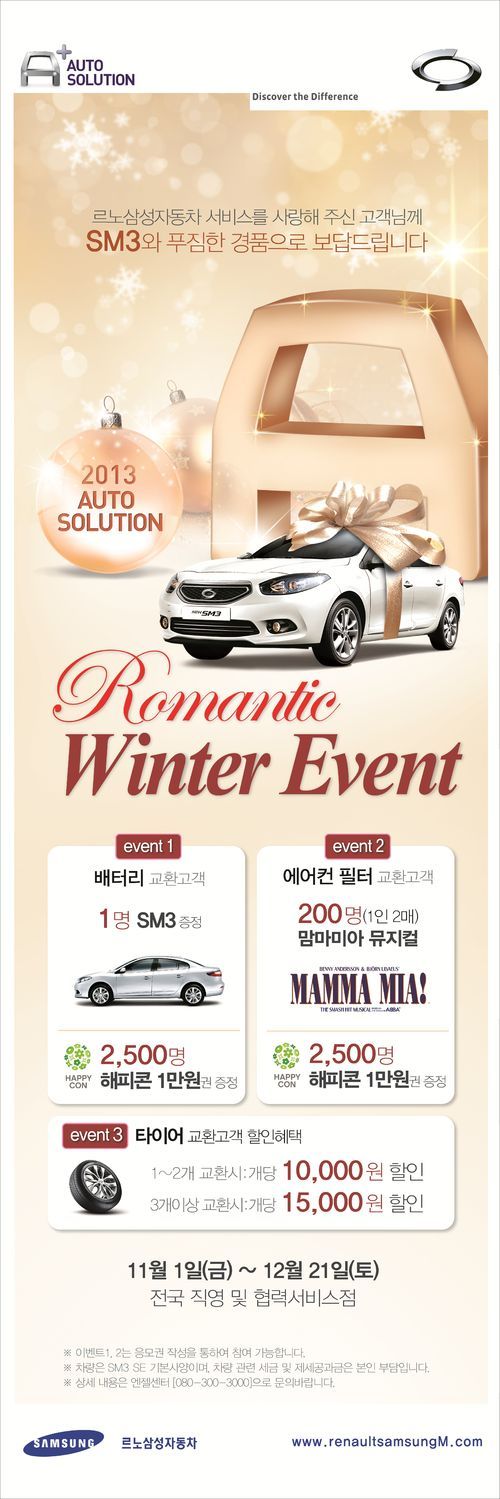 르노삼성자동차의 서비스 브랜드인 오토 솔루션은 11월 1일부터 12월 21일까지 르노삼성자동차 서비스를 이용하는 이들에게 '로맨틱 윈터 이벤트'를 통해 다양한 혜택을 제공할 예정이다.