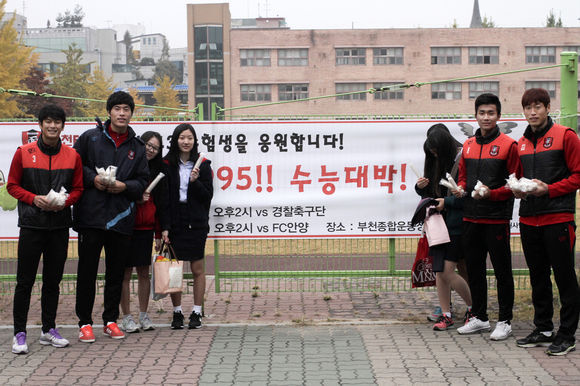 부천FC1995가 대학수학능력시험에 앞서 6일 오전 예비 소집일에 참여하는 2013학년도 수험생들을 응원했다.