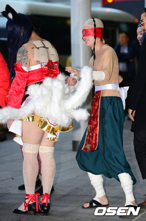 6일 오후 단독 콘서트 '슈퍼쇼5'를 위해 멕시코로 출국하는 슈퍼주니어 신동과 희철이 분장을 한 채 장난을 치고 있다.