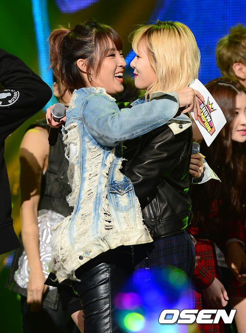 6일 오후 일산 장항동 빛마루 방송지원센터에서 진행된 MBC MUSIC '쇼 챔피언'에서 1위를 차지한 그룹 트러블메이커 현아가 포미닛 전지윤과 포옹을 하고 있다.