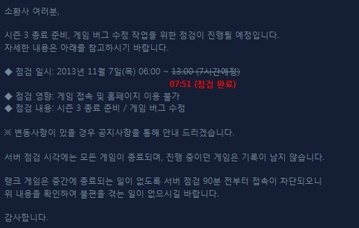 점검의 주 내용은 시즌 3 종료 준비와, 게임 버그 수정이다. 점검 중에는 게임에 접속 할 수 없으며 홈페이지도 이용할 수 없게 된다.