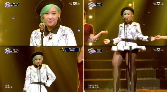 가수 유성은이 초록색으로 염색한 머리카락과 독특한 무늬의 스타킹으로 통통 튀는 비주얼을 완성시켰다.