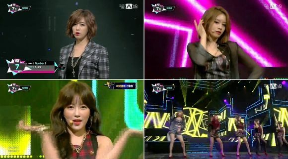 티아라는 7일 방송된 엠넷 '엠카운트다운'을 통해 '넘버나인'의 굿바이 무대를 가졌다. '넘버나인'은 흥겨운 분위기의 비트와 달리 애절한 가사를 특징으로 하는 곡. 멤버들은 늦가을의 쓸쓸한 기운이 물씬 풍기는 무대 의상과 대조를 이루는 네온컬러의 빨간색 구두로 보는 재미를 높였다.