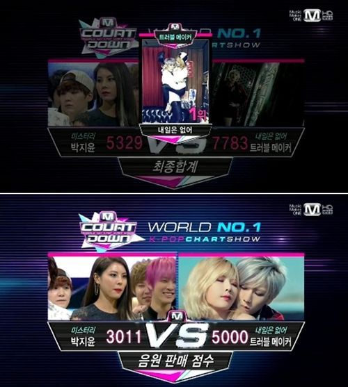 신곡 '내일은 없어'를 발표하자마자 음원차트 퍼펙트 올킬에 성공했던 트러블메이커가 7일 방송된 엠넷 '엠카운트다운'에서 1위를 차지하며 음악 프로그램 접수에 시동을 걸었다.
