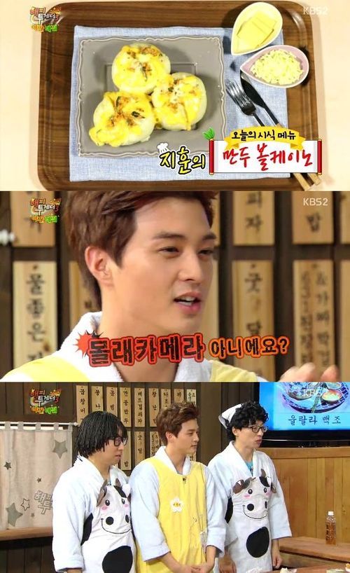 김지훈은 7일 오후 방송된 KBS 2TV 예능프로그램 '해피투게더3'에서 만두와 치즈로 만든 야식인 만두 볼케이노를 야간매점 메뉴로 출품했다.