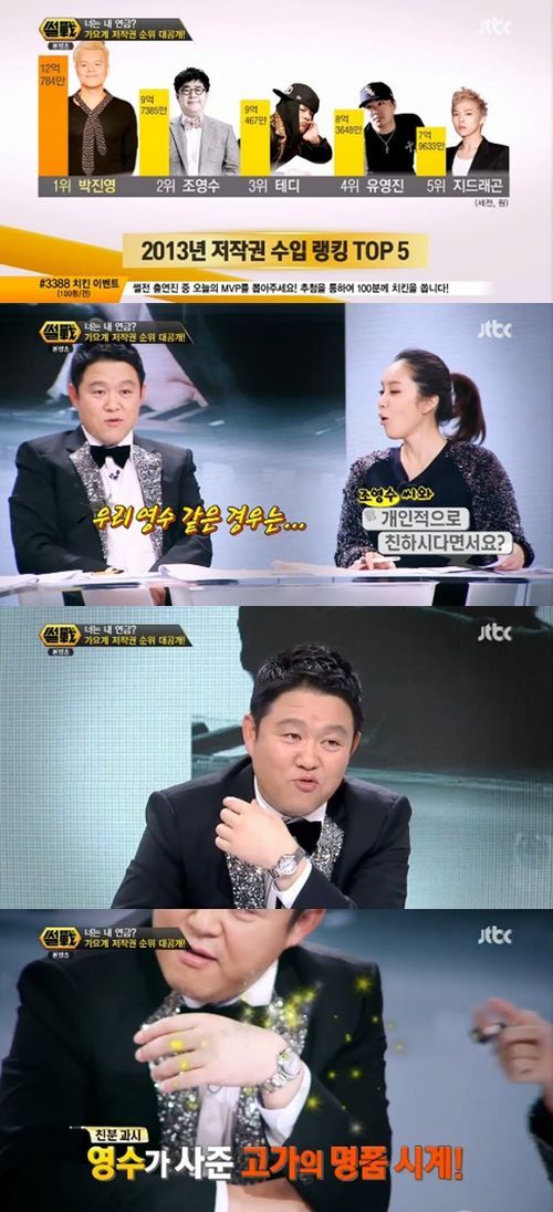 이어 김구라는 자신이 차고 나온 시계를 보여주며 “영수가 내 생일에 사준 C브랜드 시계다. 영수가 올해는 2위로 주저앉았지만 2007년부터 2011년까지 매년 10억 이상의 저작권을 벌었다”고 자랑해 웃음을 자아냈다.