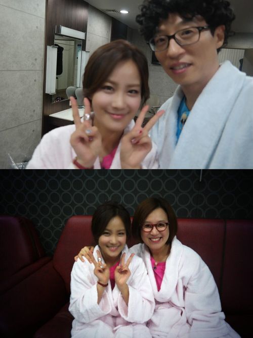 이어 그는 "같은 가르마, 같은 목욕 가운, 같은 미소, 같은 개그우먼. 같은 행복을 나눈 '해피투게더'"라는 글과 함께 선배 개그우먼 박미선과 찍은 사진을 게재했다. 실제 미모의 개그우먼으로도 유명한 두 사람은 분홍색 티셔츠에 하얀색 목욕가운을 입은, KBS 2TV '해피투게더' 속 의상을 똑같이 입고 있어 눈길을 끈다.
