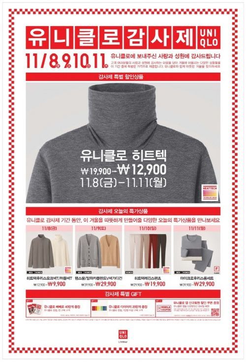 유니클로는 오는 11일까지 4일간 고객감사축제인 '유니클로 감사제'를 실시한다고 8일 밝혔다.