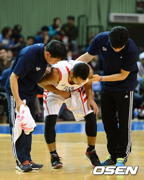 전태풍은 2쿼터 돌파에 이은 점프슛을 시도했다. 하지만 내려오는 과정에서 삼성 김명훈의 무릎에 그만 급소를 맞고 말았다. 백코트하며 힘들어 하던 전태풍, 코트에 앉아 한동안 거친 숨을 몰아쉬며 괴로움을 호소했다. 결국 교체된 전태풍은 트레이너의 안타까운 손길을 받으며 전반을 마치고 말았다.
