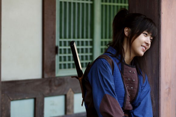 하지원은 촬영 중 환한 미소를 지으며 어딘가를 응시하고 있다. 그는 극중 역할을 위해 사내 분장을 했음에도 빛나는 미모를 뽐내고 있다.