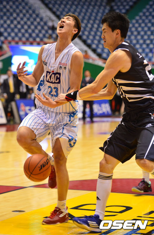 1쿼터 KCC김민구가 KT 오용준에게 파울을 당하고 있다.