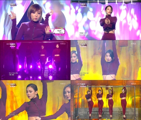 미쓰에이는 8일 오후 방송된 KBS 2TV '뮤직뱅크'에서 신곡 '허쉬(Hush)'의 무대를 공개했다.