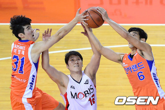 2쿼터 전자랜드 이정제와 차바위가 모비스 함지훈에 앞서 리바운드를 잡아내고 있다.