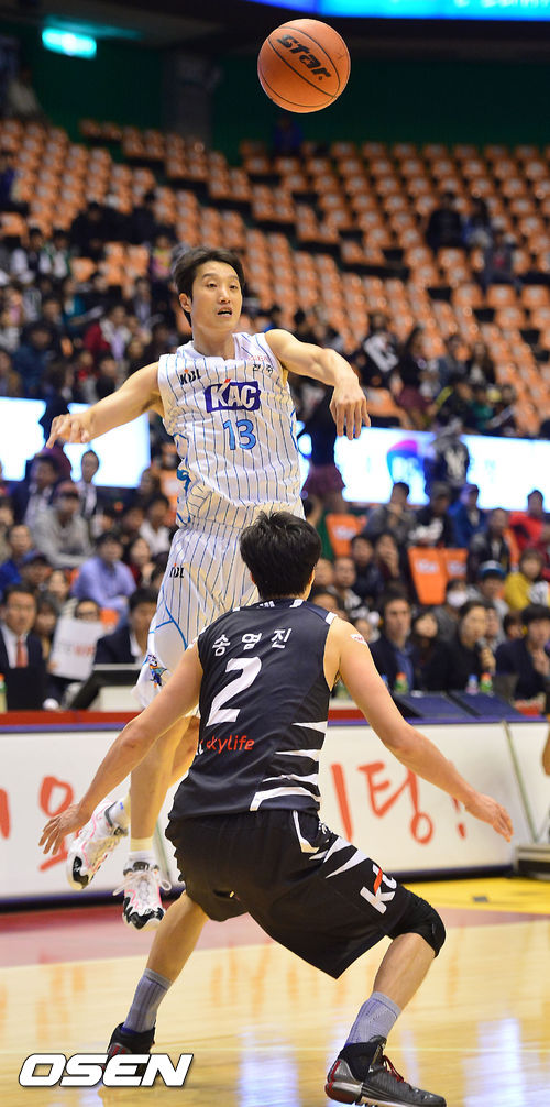 2쿼터 KCC 이한권이 림을 향해 패스를 하고 있다.