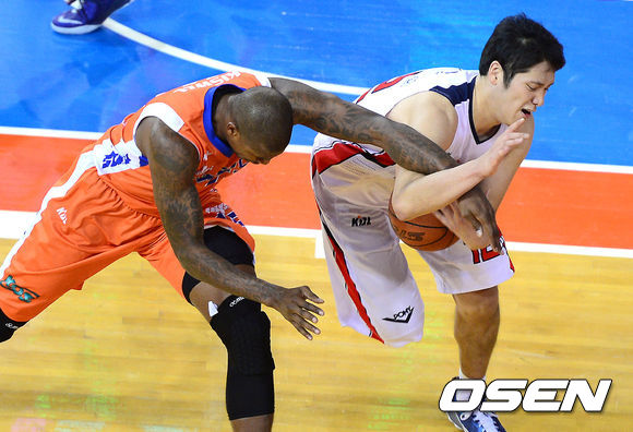 2쿼터 모비스 함지훈이 전자랜드 포웰과 볼을 다투고 있다.