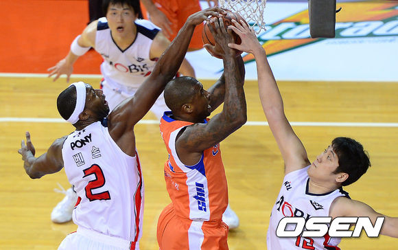 2쿼터 전자랜드 포웰이 모비스 벤슨과 함지훈에 슛블록 당하고 있다.